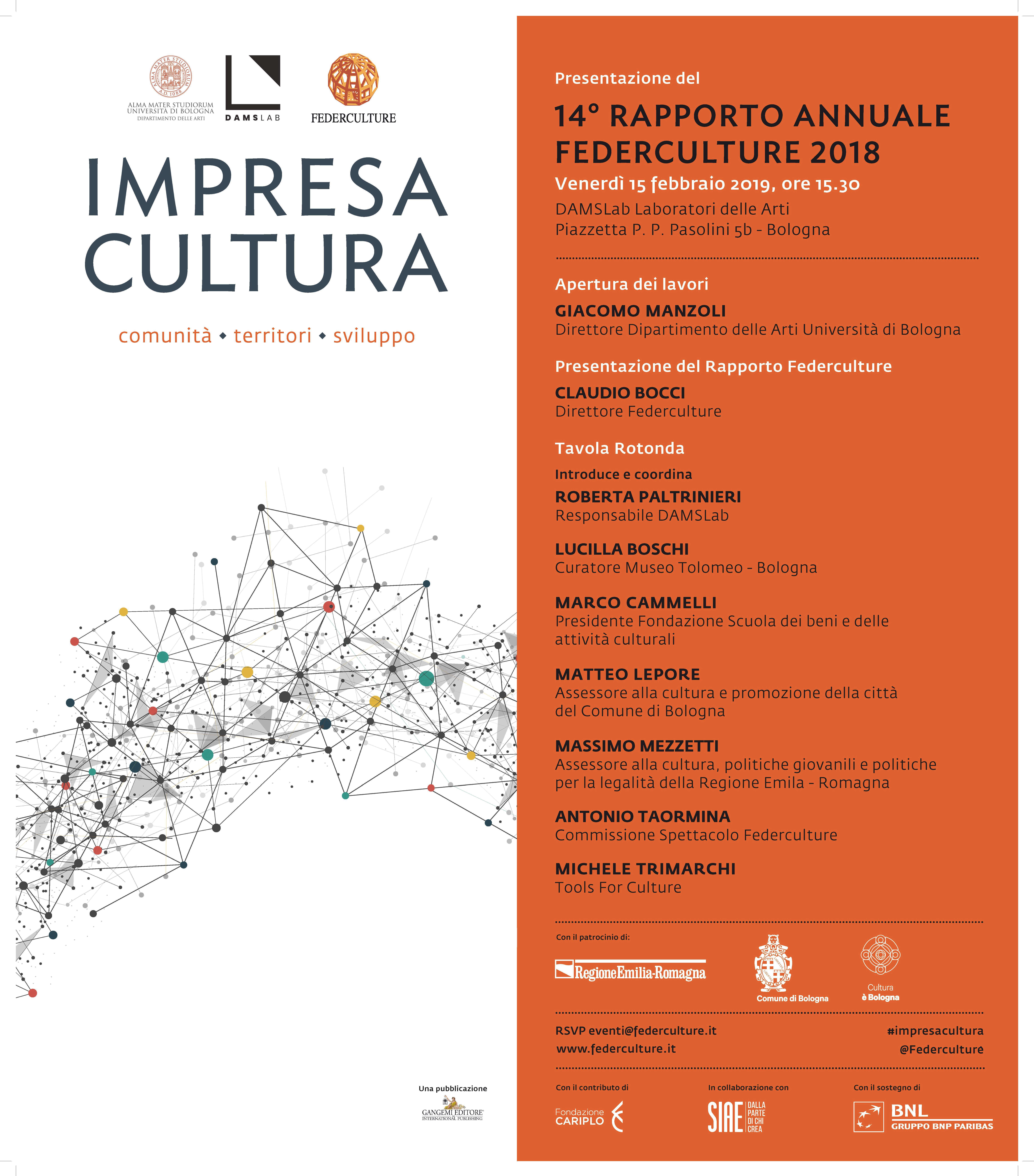 Presentazione del Rapporto Federculture 2018 “Impresa Cultura. Comunitร , territori, sviluppo”, il prossimo 15 febbraio 2019 alle ore 15,30 presso DAMSLab Laboratori delle Arti, Piazzetta P. P. Pasolini 5b – Bologna.