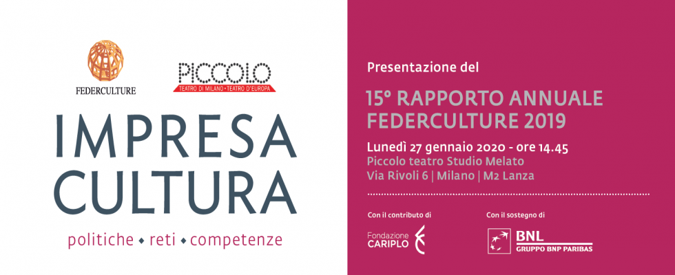 Lunedì 27 gennaio verrà presentata a Milano la quindicesima edizione del Rapporto Annuale Federculture IMPRESA CULTURA. Politiche, reti, competenze il volume che rappresenta ormai un fondamentale punto di riferimento per mappare il variegato arcipelago delle politiche, dei consumi e delle imprese culturali. L’appuntamento, promosso in collaborazione con il Piccolo Teatro di Milano, prevede un articolato programma di interventi: dopo l’apertura dei lavori di FILIPPO DEL CORNO, Assessore alla Cultura Comune di Milano e STEFANO BRUNO GALLI, Assessore all’ Autonomia e Cultura Regione Lombardia e l’intervento di SERGIO ESCOBAR, Direttore Fondazione Piccolo Teatro di Milano, il Rapporto Annuale sarà presentato da CLAUDIO BOCCI, Direttore Federculture.