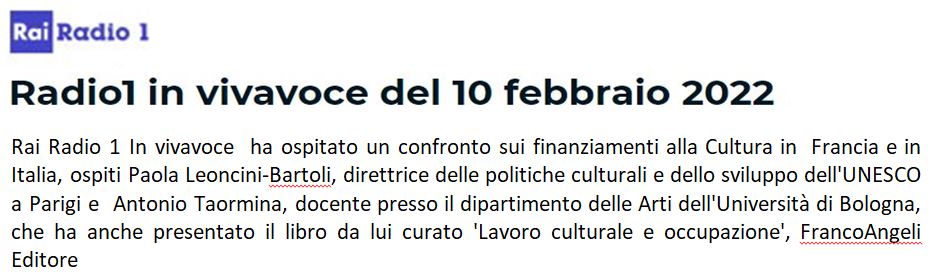 Il Sole 24Ore Arteconomy, 14 agosto 2022 Un articolo di Daniele Donati di particolare interesse sullo stato attuale dello spettacolo e della cultura. Nell’articolo si cita LAVORO CULTURALE E OCCUPAZIONE a cura di Antonio Taormina. https://www.ilsole24ore.com/art/il-destino-professioni-culturali-tempi-stretti-e-poche-speranze-AEVgaEsB?fbclid=IwAR3CgjPRJN7TxzGB7TxAlB_9UgYGUqNAEdSuzI7bw5rjmLgyyqitp5EaDtQ