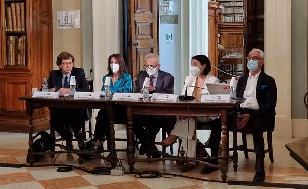 Nella foto, da sinistra: Antonio Taormina, Fulvio Macciardi, Gianni Cottafavi, l’Assessore alla Cultura del Comune di Bologna Davide Conte, Roberta Paltrinieri e Michele Trimarchi